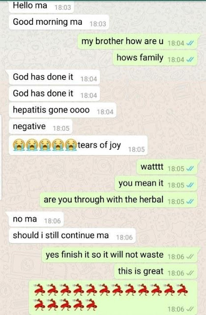 After 8 MONTHS OF ORTHODOX TREATMENT WITHOUT SATISFIED RESULT, my partner suggested that we try other means of treatment just in case we’d find a remedy there. We Asked, read, research, and tried numerous remedies but kept testing positive after every test. I give up and told my partner not to let us waste any more money on treatments. We Returned to believe the fact that the virus would leave my system by itself eventually. I got off any form of medication in 2019. It was on August 2019, that’s my partner shared a link on Facebook while he was away on an official assignment in the Central Region, and when I clicked on the link, and let me onto a page that suggested an organic treatment for hepatitis b.